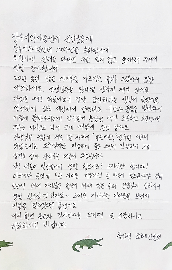 신서희 씨는 "이곳에서 제10대와 20대와 지금까지 함께 보냈습니다. 초등학교 졸업 후 더 이상 센터에 다닐 수 없다고 생각했지만, 저 역시 자연스럽게 자원봉사자로 합류하여 중고등학교 시절을 그렇게 센터와 함께 보냈습니다"라며 "성인이 되어 타지역에 살며 자주 찾아뵙지는 못했지만, 오랜만에 찾아가도 늘 변함없이 반갑게 맞아주던 딸기 쌤과 달리 쌤의 따뜻한 미소는 언제나 큰 위로가 되었습니다. 그 따뜻함이 있었기에 제가 이곳을 잊지 않고 돌아올 수 있었던 것 같습니다"라고 전했다.