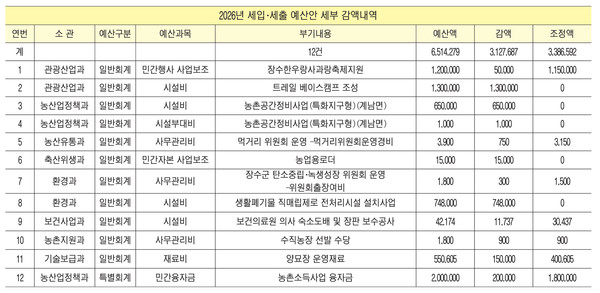 먼저 2026년도 본예산 일반회계 세출예산 중 삭감 내역을 살펴보면 △트레일 베이스캠프 조성 13억원(관광산업과) △ 농촌공간정비사업 특화지구형 계남면 6억5천만원(시설비, 농산업정책과) △농촌공간정비사업 특화지구형 1백만원(시설부대비, 농산업정책과) △농업용로더 1천500만원(축산위생과) △생활폐기물 직매립제로화 전처리시설 설치사업 7억4천800만원(환경과) 등은 전액 삭감됐다.