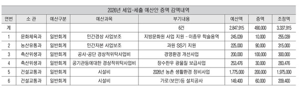 이어 2026년도 본예산 일반회계 세출예산 중 세부 증액 내역을 살펴보면 △지방문화원 사업 지원-이종무 학술용역에 1천만원이 증액된 2억5천503만9천원(문화체육과) △과원 SS기 지원은 9천만원이 증액된 3억1천500만원(농산유통과) △경영환경 개선사업은 1억원이 증액된 3억원(축산위생과) △장수한우 광물질 보급사업은 3천만원이 증액된 2억8천347만6천원(축산위생과) △2026년도 농촌 생활환경 정비사업은 2억원이 증액된 19억7천500만원(건설교통과) △가로(보안)등 설치공사는 6천만원이 증액된 2억940만원으로 조정됐다.(건설교통과)